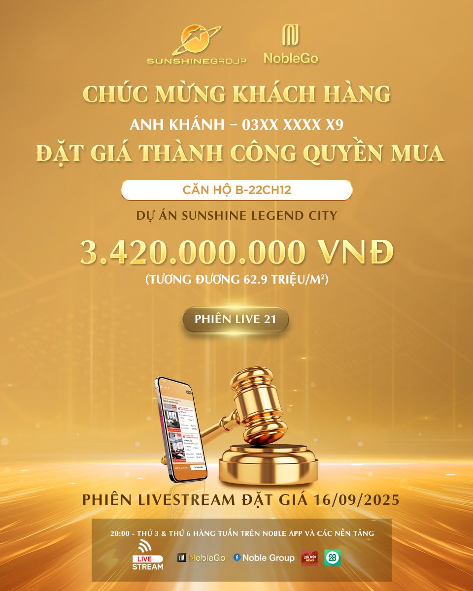 Vào tối ngày 16/09/2025, phiên livestream NobleGo #21 đã khép lại thành công với hai giao dịch gọi tên chủ nhân mới của cặp căn hộ Flex One VIP 1PN+ tại tòa S1 Sunshine Legend City, được trang bị nội thất tinh tế và hoàn thiện theo chuẩn quốc tế.