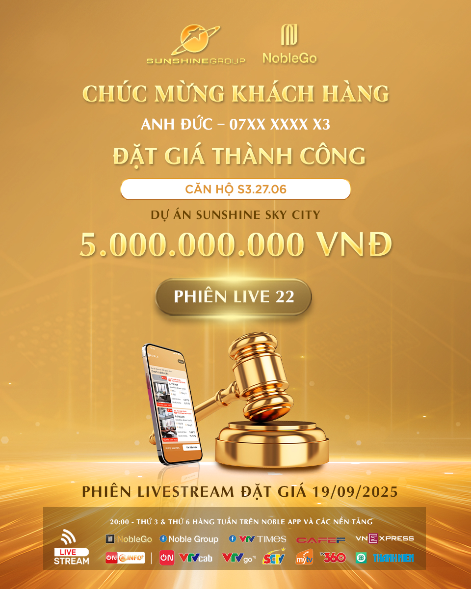 Vào tối ngày 19/09/2025, phiên livestream NobleGo #22 đã khép lại thành công và gọi tên 2 chủ nhân mới của 2 căn hộ cao cấp thuộc dự án Sunshine Sky City – Tổ hợp Thương mại – Dịch vụ – Căn hộ “chuẩn khách sạn” 4.0 ven sông đầu tiên tại khu Nam Sài Gòn.