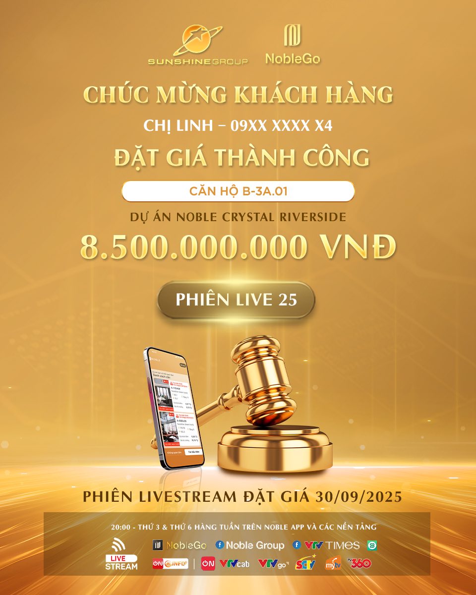 Tối ngày 30/09/2025, phiên livestream NobleGo #25 đã thành công tốt đẹp với việc gọi tên chủ nhân mới của cặp căn hộ B-03.01 và B-3A.01 tại Noble Crystal Riverside.